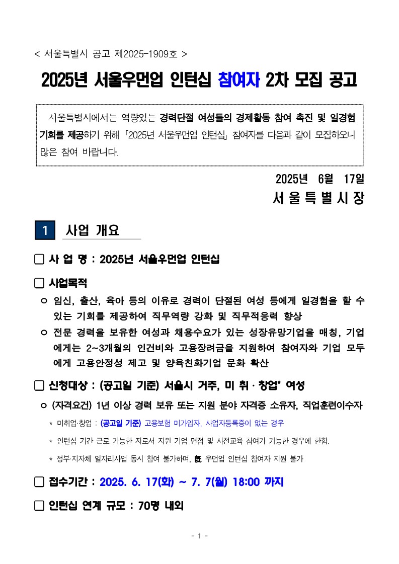 서울특별시에서는 역량있는 경력단절 여성들의 경제활동 참여 촉진 및 일경험 기회를 제공하기 위해「2025년 서울우먼업 인턴십」참여자를 다음과 같이 모집하오니많은 참여 바랍니다.