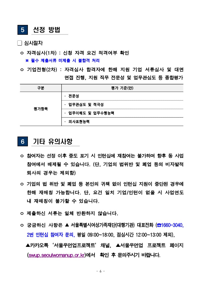 - ㅇ 궁금하신 사항은 ▲ 서울특별시여성가족재단(대행기관) 대표전화 (☎1660-3040, 2번 인턴십 참여자 문의, 평일 09:00~18:00, 점심시간 12:00~13:00 제외), ▲카카오톡 ‘서울우먼업프로젝트’ 채널, ▲서울우먼업 프로젝트 페이지(swup.seoulwomanup.or.kr)에서 확인 후 문의주시기 바랍니다.