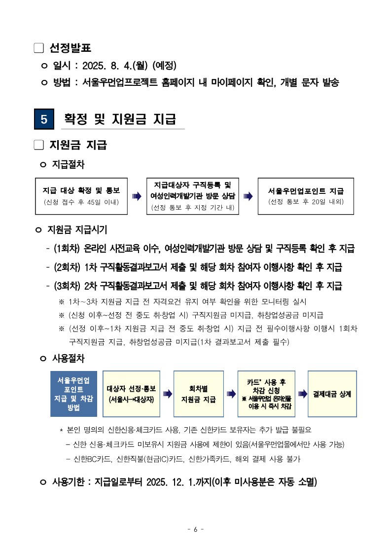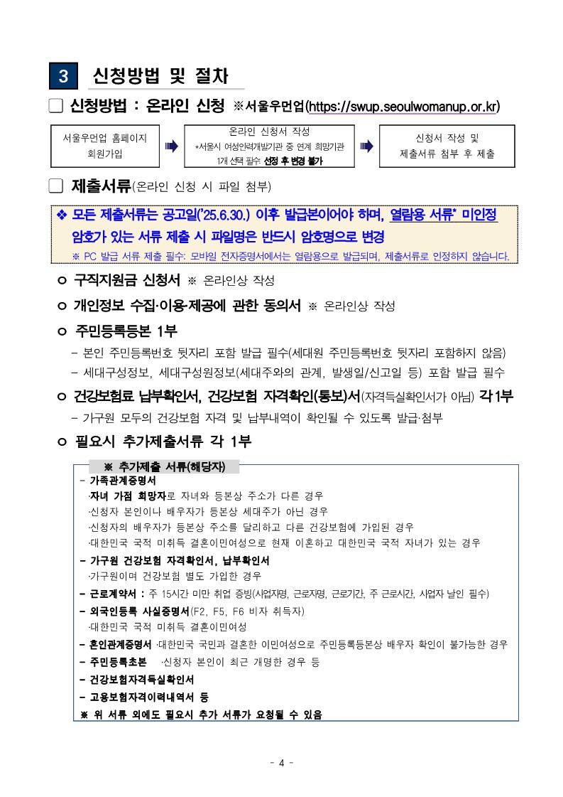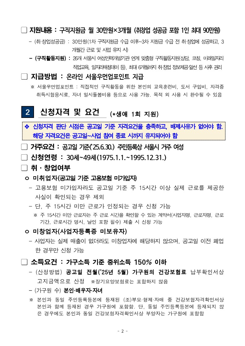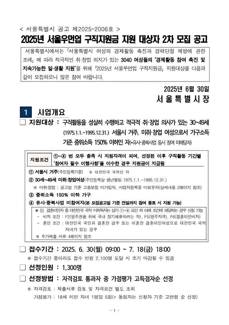 2025년 서울우먼업 구직지원금 지원 대상자 2차 모집 공고