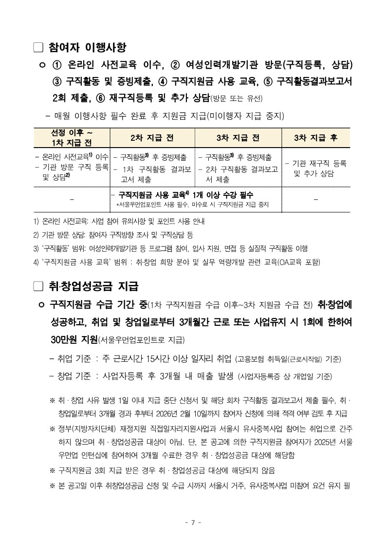 취·창업성공금 대상이 아님. 단, 본 공고에 의한 구직지원금 참여자가 2025년