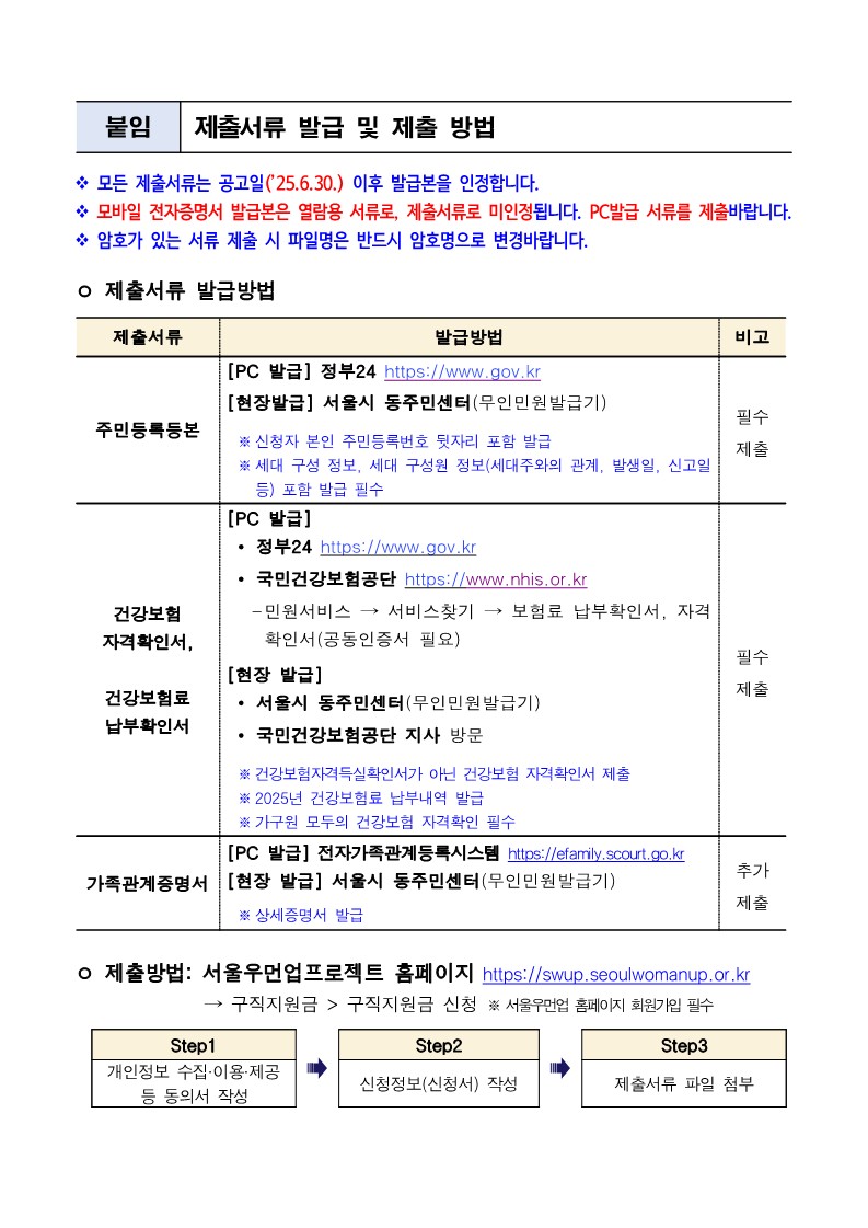 - 모든 제출서류는 공고일(’25.6.30.) 이후 발급본을 인정합니다.